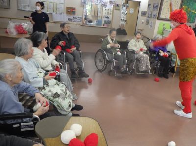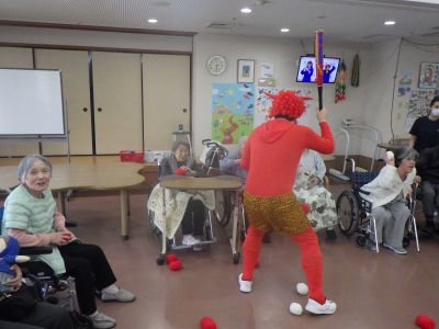 青と赤の鬼に豆に見立てた玉を投げ、