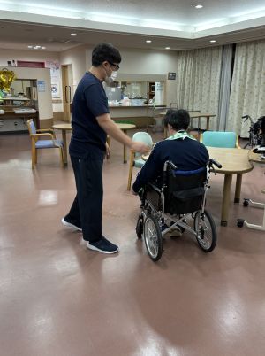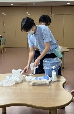 利用者の嘔吐処理係(更衣)、関節対応係(換気・個室確保・必要物品の準備)に分かれて、