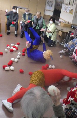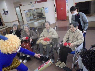 青と赤の鬼に豆に見立てた玉を投げ、